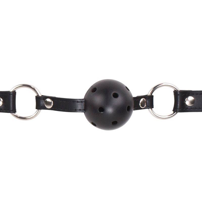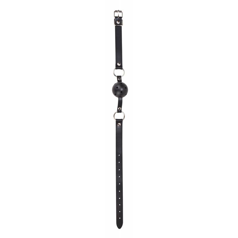 Bâillon avec boule dure à trous (pour faciliter la respiration) muni de sangles de cuir de bonne qualité, avec une couture élégante sur la longueur de celles-ci.