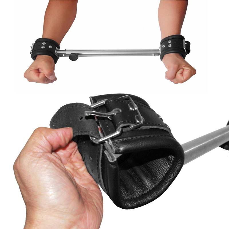 Barre d'écartement en acier réglable de 40cm à 55cm de long à son maximum avec menottes/Chevillères en cuir molletonné à chaque extrémité.