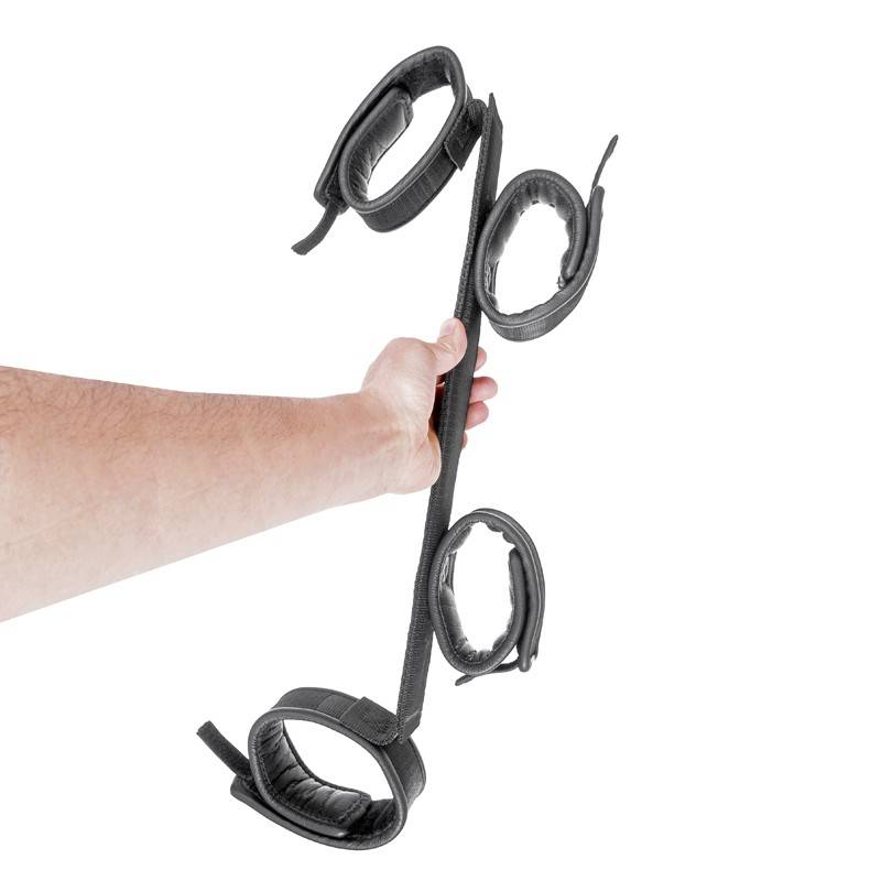 Barre d'écartement en nylon renforcé (sous le nylon) avec une plaque dure non flexible. Sur cette barre en nylon sont cousues 2 menottes et 2 chevillières, qui sont donc fixes.