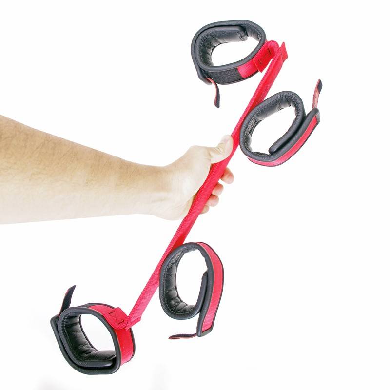 Barre d'écartement en nylon rouge, renforcé (sous le nylon) avec une plaque dure non flexible. Sur cette barre en nylon sont cousues 2 menottes et 2 chevillières, qui sont donc fixes.