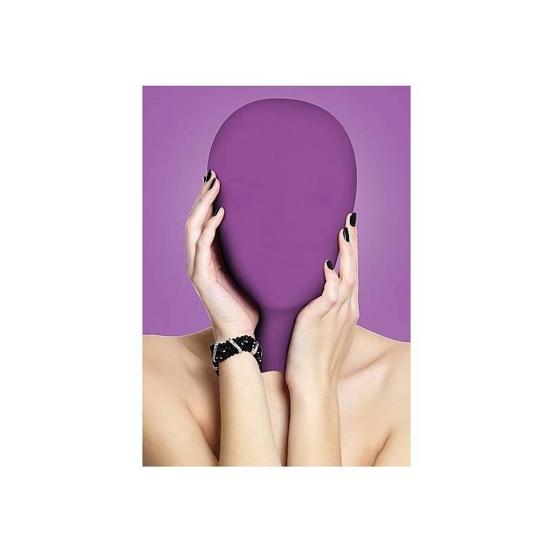Cagoule en tissu soyeux légèrement extensible de couleur violet . AUCUNE ouverture. Système de fermeture/ouverture par zip sur l'arrière de la cagoule.