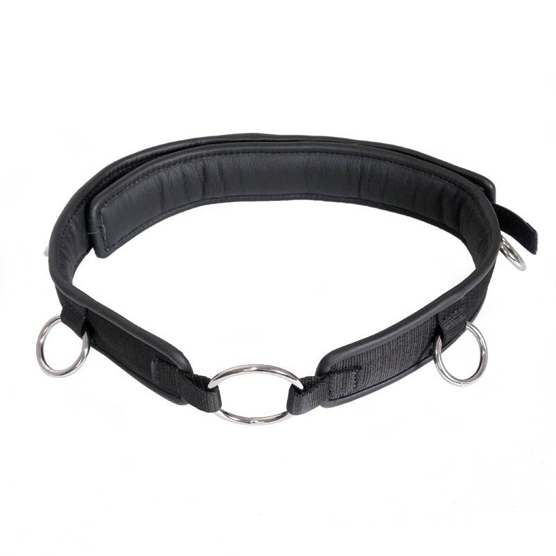 Ceinture de bondage en nylon noir coté extérieur et cuir noir molletonné sur la partie intérieur. Un gros anneau central en métal est situé sur l'avant, 2 autres plus petits sont situés de chaque coté et 1 dernier est situé derrière.