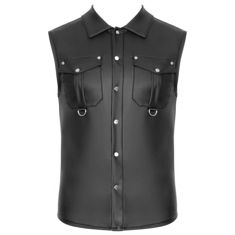 Une chemise sans manche au look wetlook mat, taillée pour sublimer la carrure et les jeux de pouvoir. Un basique fetish revisité, entre virilité assumée et sensualité sobre.