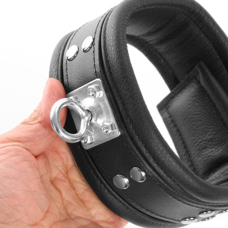 Collier en cuir noir molletonnées avec rembourrage sur les bords pour un maximum de confort. Une "sur" lanière rivetée au collier et contenant 10 trous avec boucle permet un maintien parfait quelque soit votre taille de cou.