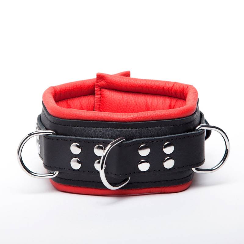 Collier en cuir noir et rouge de très bonne qualité avec 3 anneaux en métal et une "sur" lanière rivetée, de la "collection Dèmonia".