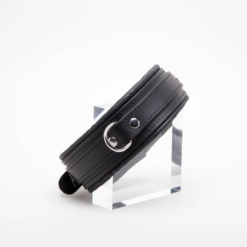 Autorisez vous un peu de confort lors de vos jeux BDSM avec ces chevillères molletonnées. Collection Dèmonia Cuir noir "Sur" lanières rivetées et anneau métal Molletonnées à l'intérieur 12 positions de réglages