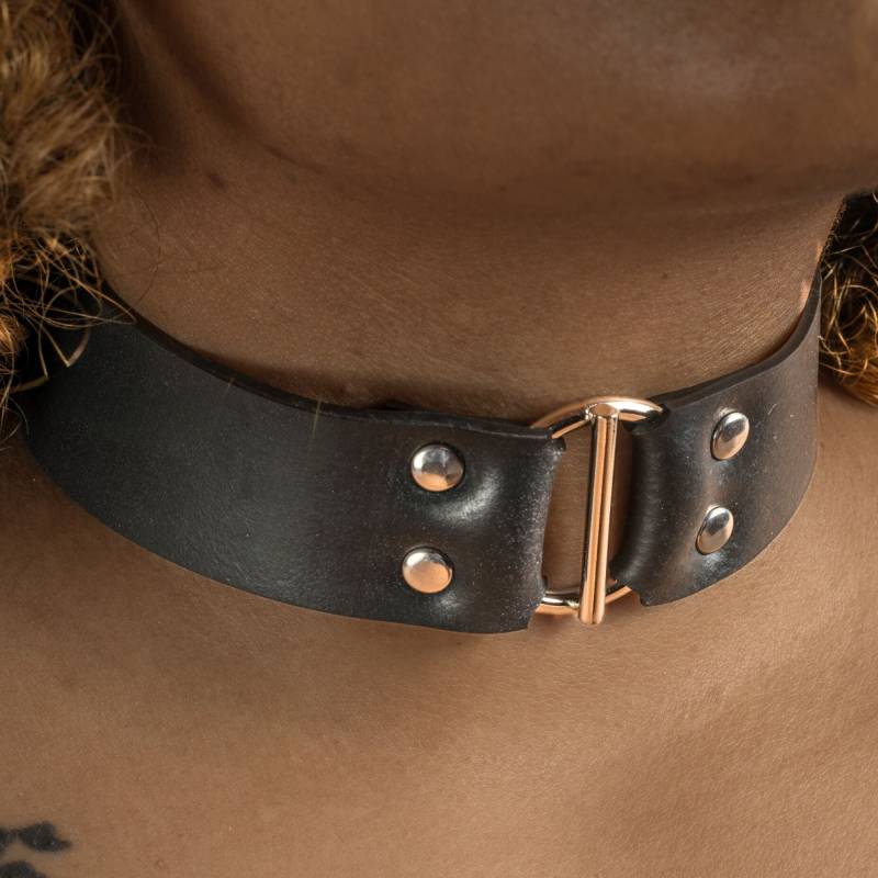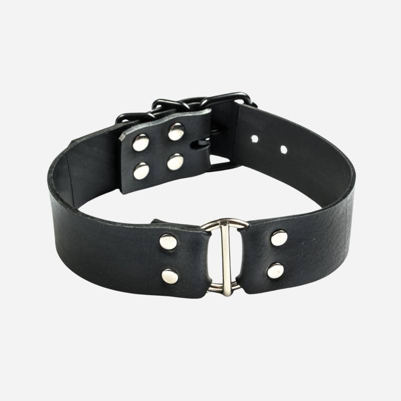 Avec ses 30 mm de largeur, ce collier choker dégage une allure forte et raffinée. La quincaillerie en acier inoxydable, comprenant une boucle noire et des passants robustes, ajoute une touche industrielle élégante.