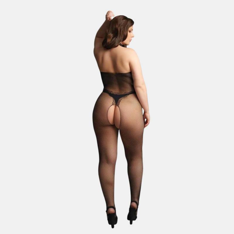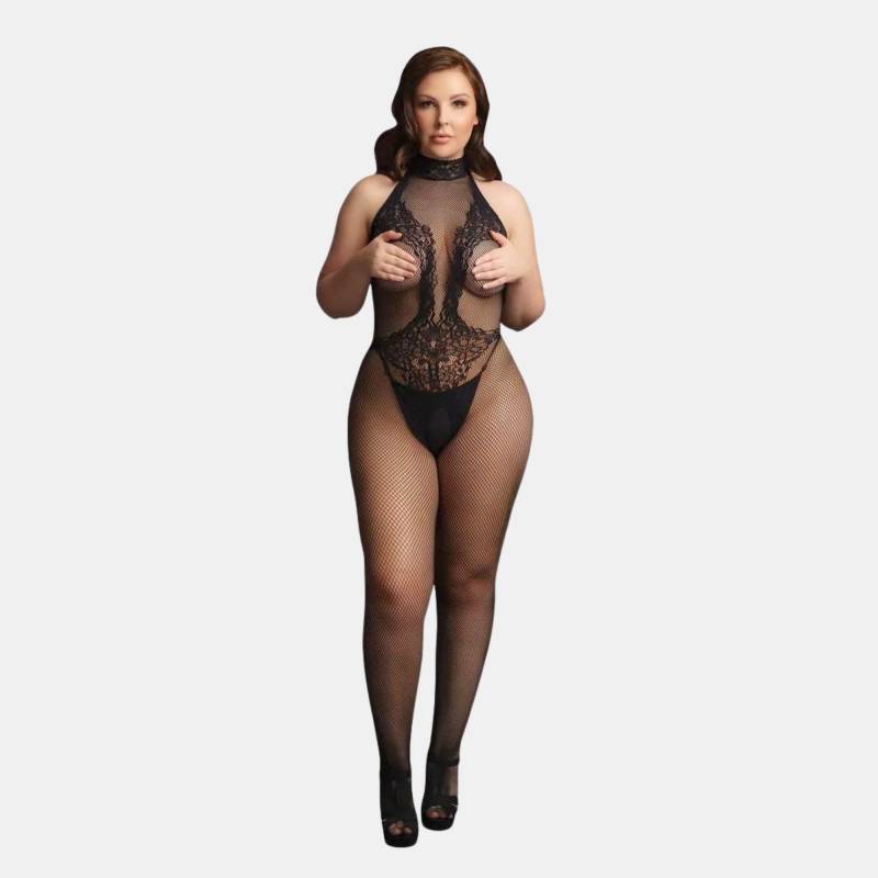 Cette combinaison moulante associe la finesse d’une résille souple à l’élégance d’une dentelle florale. Le design met l’accent sur les courbes du corps et le jeu de transparence, pour un effet ultra sexy. Le col façon choker apporte une touche dominatrice, tandis que l’ouverture à l’entrejambe promet une lingerie aussi belle que fonctionnelle.