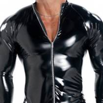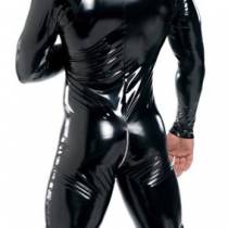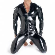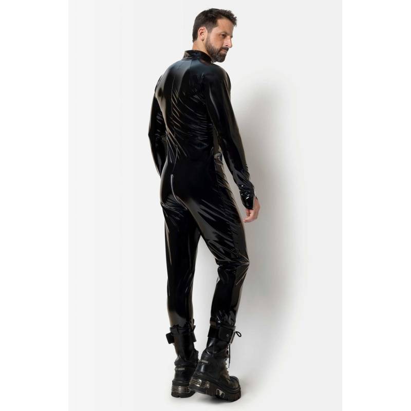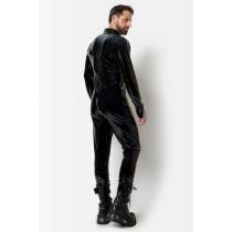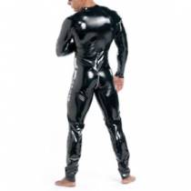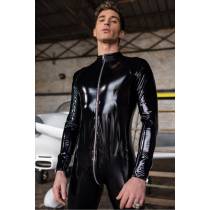 Combinaison pour homme avec un long zip partant du cou et remontant jusqu'au niveau des reins avec 3 curseurs, et un zip à chaque manche au niveau des poignets.