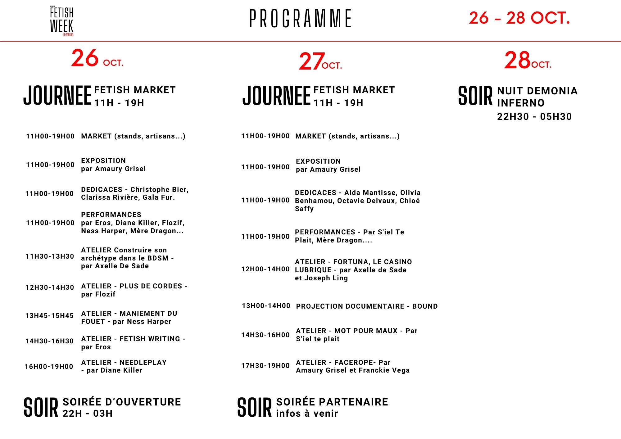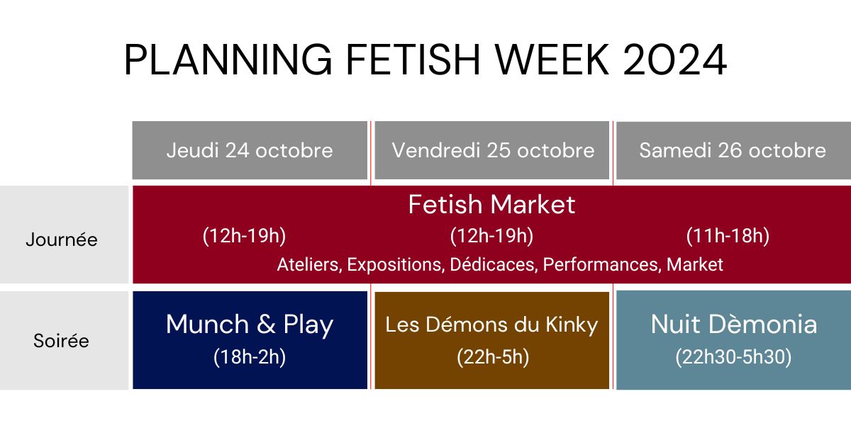 La Fetish Week revient pour une nouvelle édition du 24 au 26 octobre 2024 en mettant à l'honneur Fetish & BDSM. Au programme : 3 jours de Fetish Market, Deux espaces d'expositions, une dizaine d'ateliers et de performances, un espace de discussion avec une sexcoach, un Munch & Play, des soirées Kinky, Fetish & BDSM et plein d'autres concepts à découvrir.