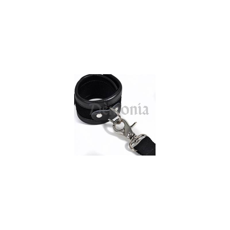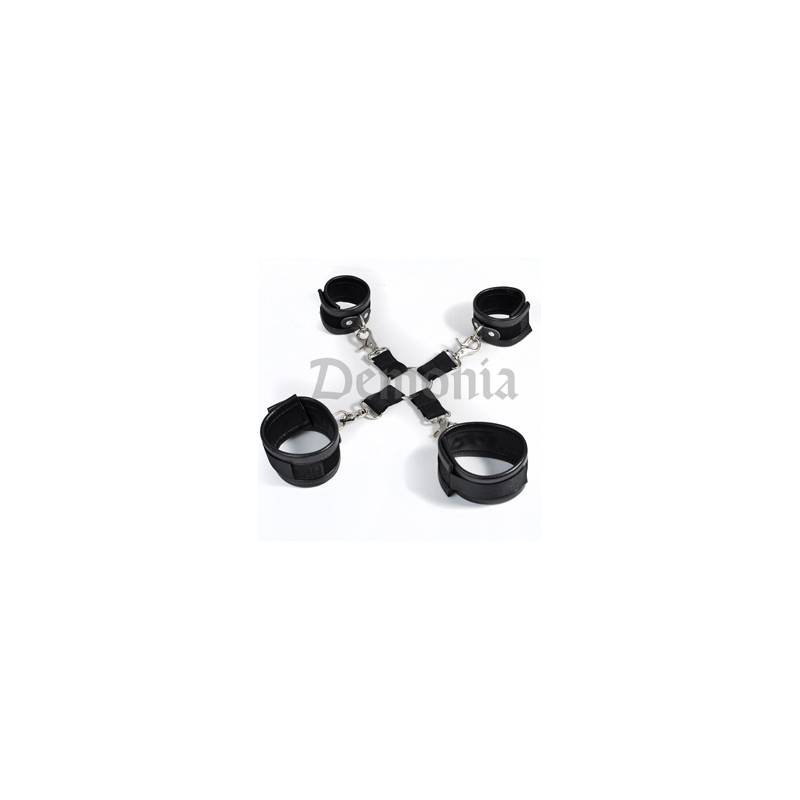 Contrainte en tissu et en croix munie de 4 mousquetons que vous accrocherez aux deux menottes et aux 2 chevillères.