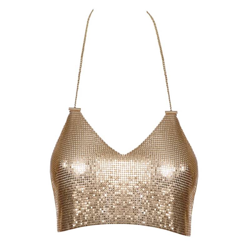 Un top court spectaculaire en métal doré pour briller sous la lumière et révéler chaque courbe avec éclat. Un bijou de corps à lui seul, souple, ajustable et irrésistiblement sensuel.