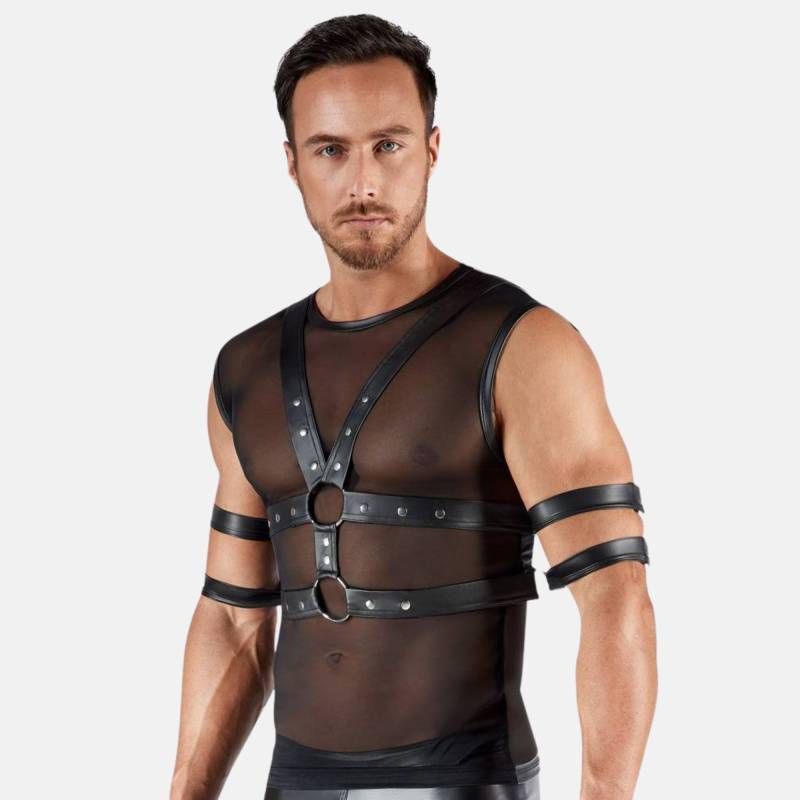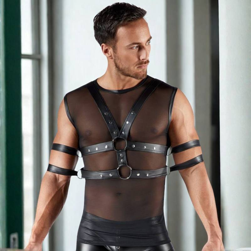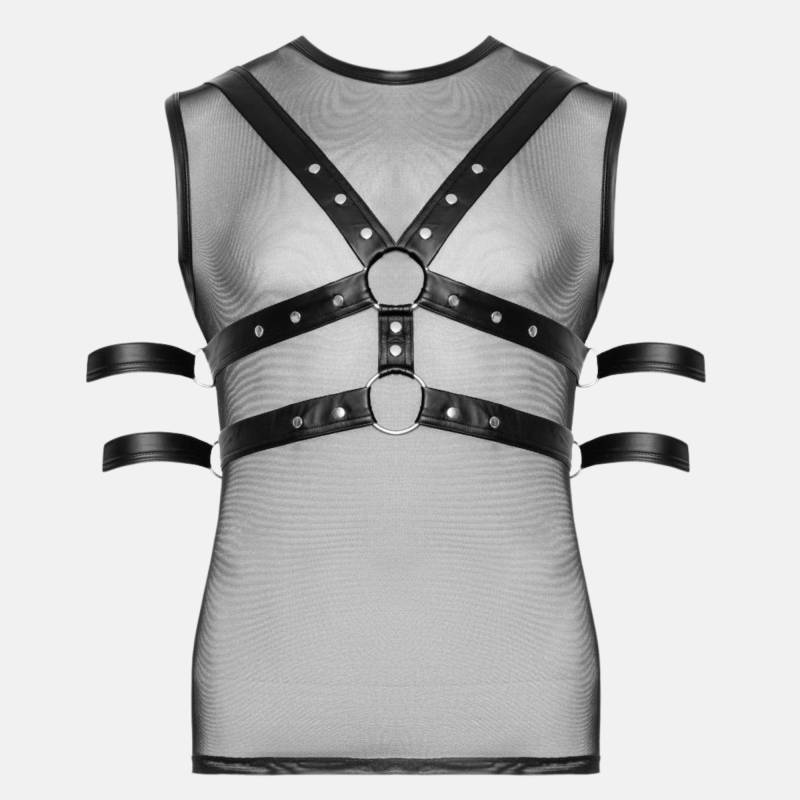 Combinez sensualité et domination avec ce débardeur en powernet transparent et harnais de poitrine amovible. Une pièce hybride qui expose, retient et fascine.
