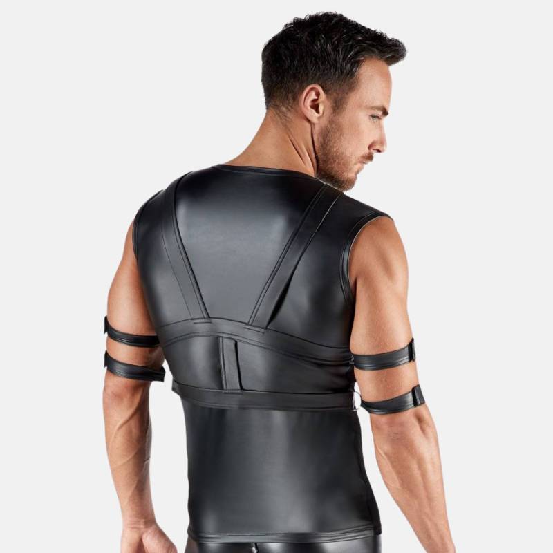 Ce débardeur fetish allie transparence sensuelle et esthétique bondage. Le powernet léger dévoile le torse tandis que le wetlook mat souligne la musculature. Le harnais de poitrine, amovible et ajustable, structure la silhouette et offre plusieurs points d’attache. L’ensemble incarne une tension parfaite entre liberté et contrainte.