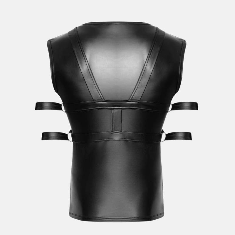 Porté seul, il attire le regard sur le torse et les attaches. Combiné à un pantalon wetlook ou un short cuir, il crée une silhouette puissante et sensuelle. Idéal pour les sessions de domination, les performances fetish ou les soirées BDSM où chaque détail compte.