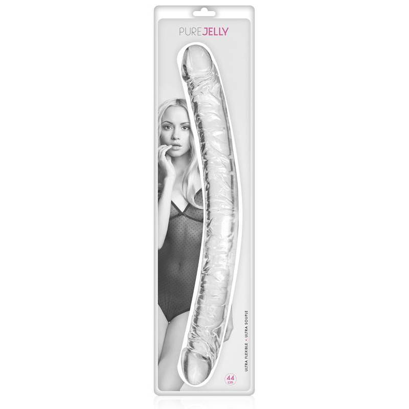 Double dong transparent XL (44cm pour un diamètre de 4cm) réalisé dans la matière Jelly (matière spéciale, souple tout en gardant une rigidité nécessaire à ce type de toys). Ce double dong vous permettra de nombreuses possibilités de positions dans vos ébats amoureux.