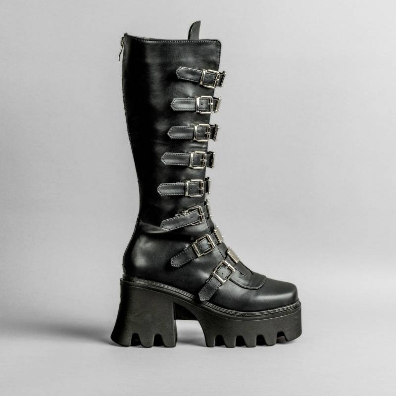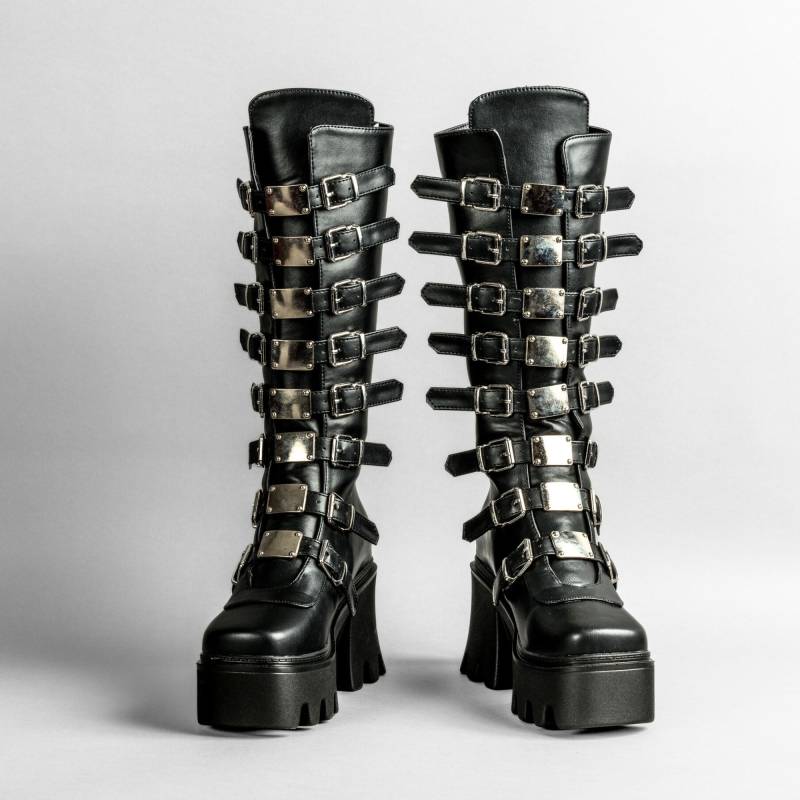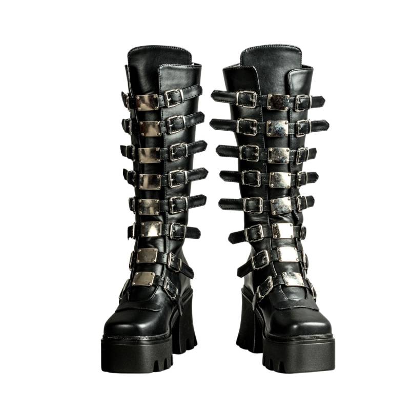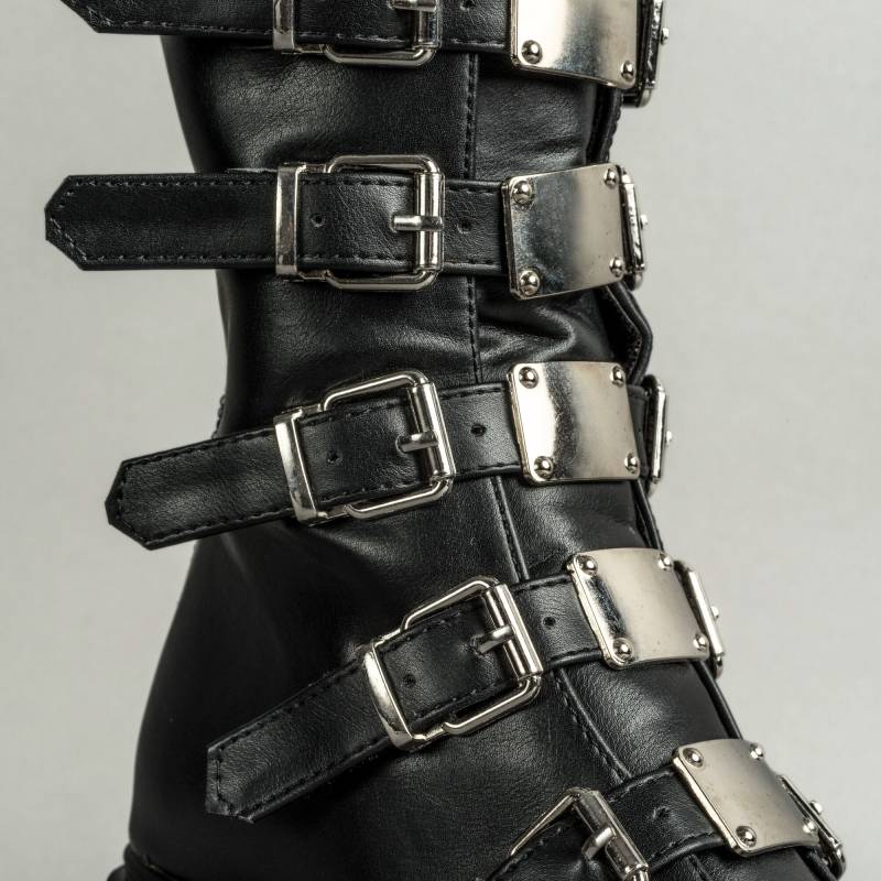 Les Drako Similicuir sont des bottines conçues pour un style gothique et alternatif. Dotées d’une plateforme de 4 cm et d’un talon de 8 cm en caoutchouc, elles offrent une hauteur et une présence marquante. Elles se distinguent par leurs 8 sangles à boucle et leurs plaques métalliques, renforçant une esthétique industrielle et brute.