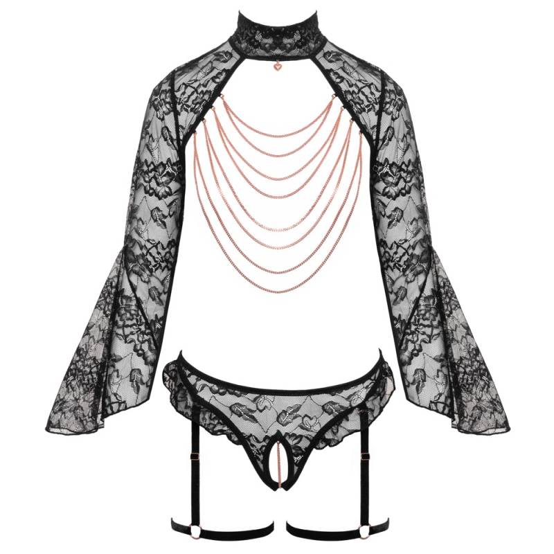 Ensemble dentelle ouvert avec boléro, slip jarretelles et chaînes rose gold amovibles. Design sensuel, seins libres et entrejambe ouvert.