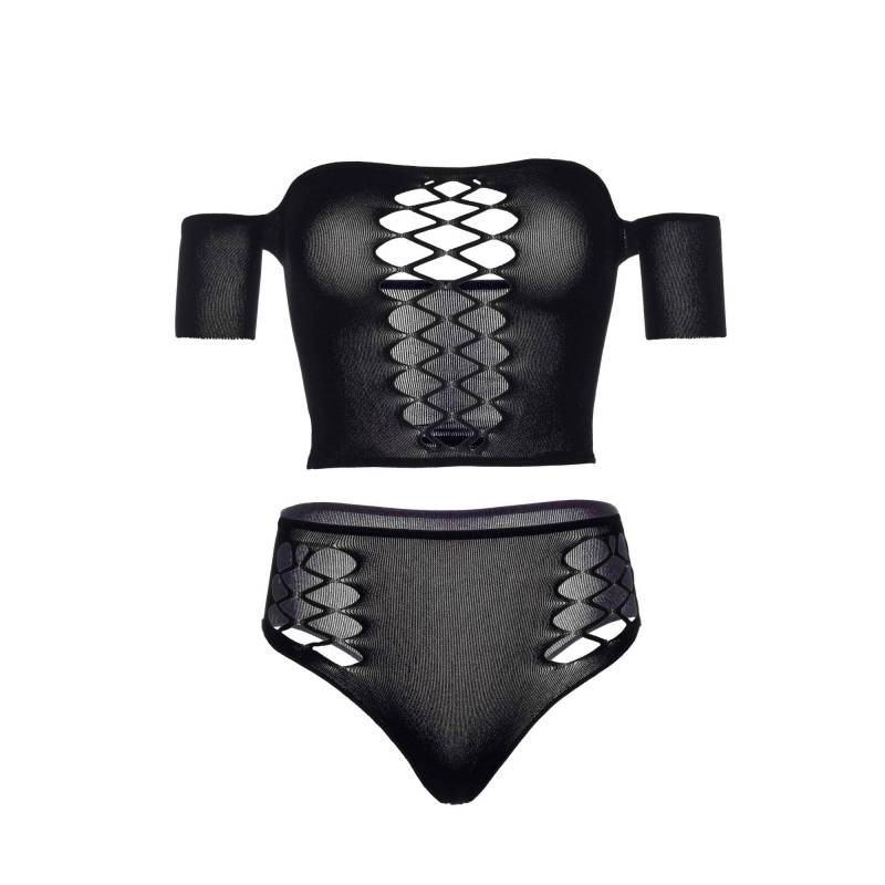 Ensemble Top épaules dénudées avec lanières et string taille haute , lanières sur les côtés.
