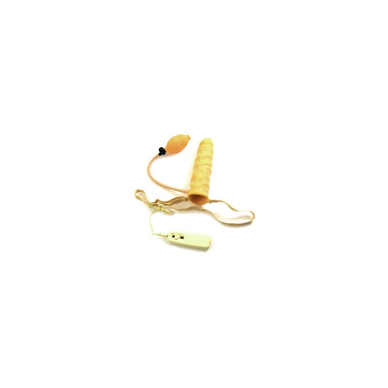 Etui pénien vibrant et gonflable en latex couleur chair, équipéd'un ruban élastique réglable, avec une poire équipée d'une soupapeet d'une télécommande a fil avec variateur de vitesse.