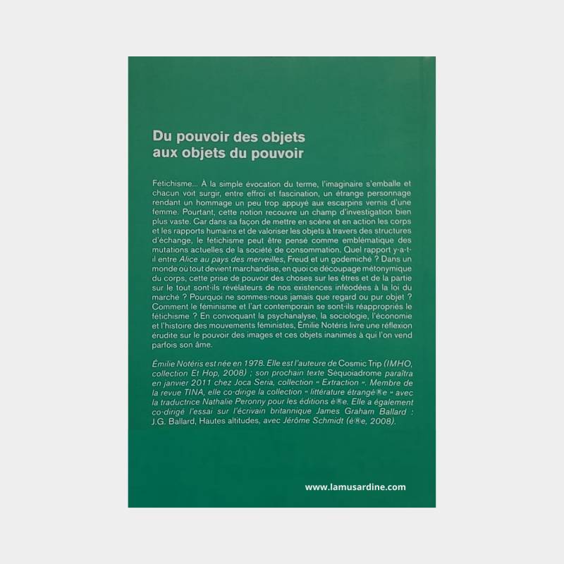 Fétichisme... À la simple évocation du terme, l’imaginaire s’emballe et chacun voit surgir, entre effroi et fascination, un étrange personnage rendant un hommage un peu trop appuyé aux escarpins vernis d’une femme. Pourtant, cette notion recouvre un champ d’investigation bien plus vaste. Car dans sa façon de mettre en scène et en action les corps et les rapports humains et de valoriser les objets à travers des structures d’échange, le fétichisme peut être pensé comme emblématique des mutations actuelles de la société de consommation. Quel rapport y-a-t’il entre Alice au pays des merveilles, Freud et un godemiché ? Dans un monde où tout devient marchandise, en quoi ce découpage métonymique du corps, cette prise de pouvoir des choses sur les êtres et de la partie sur le tout sont-ils révélateurs de nos existences inféodées à la loi du marché ? Pourquoi ne sommes-nous jamais que regard ou pur objet ? Comment le féminisme et l’art contemporain se sont-ils réappropriés le fétichisme ? En convoquant la psychanalyse, la sociologie, l’économie et l’histoire des mouvements féministes, Émilie Notéris livre une réflexion érudite sur le pouvoir des images et ces objets inanimés à qui l’on vend parfois son âme.