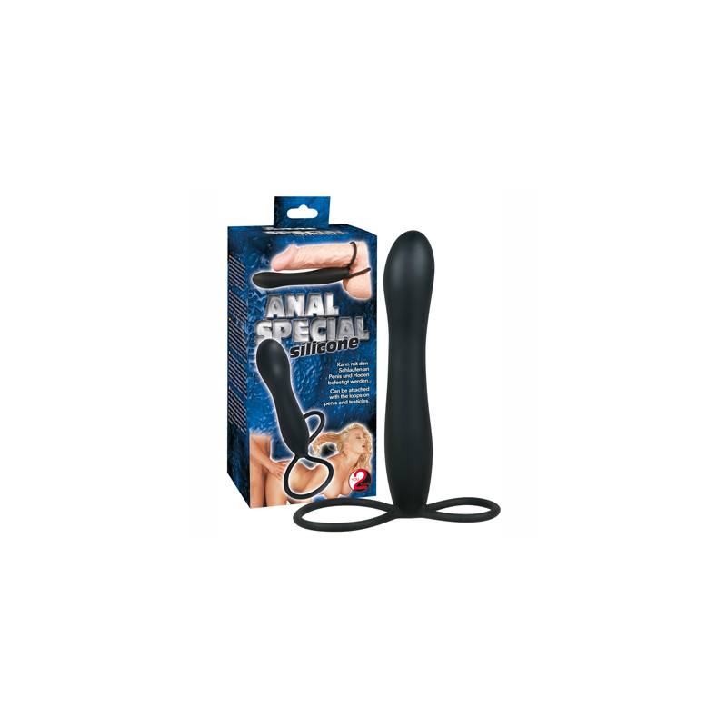Gode anal noir en silicone. Sa grande particularité est de se fixer sur le pénis et les testicules afin de pratiquer la double pénétration.