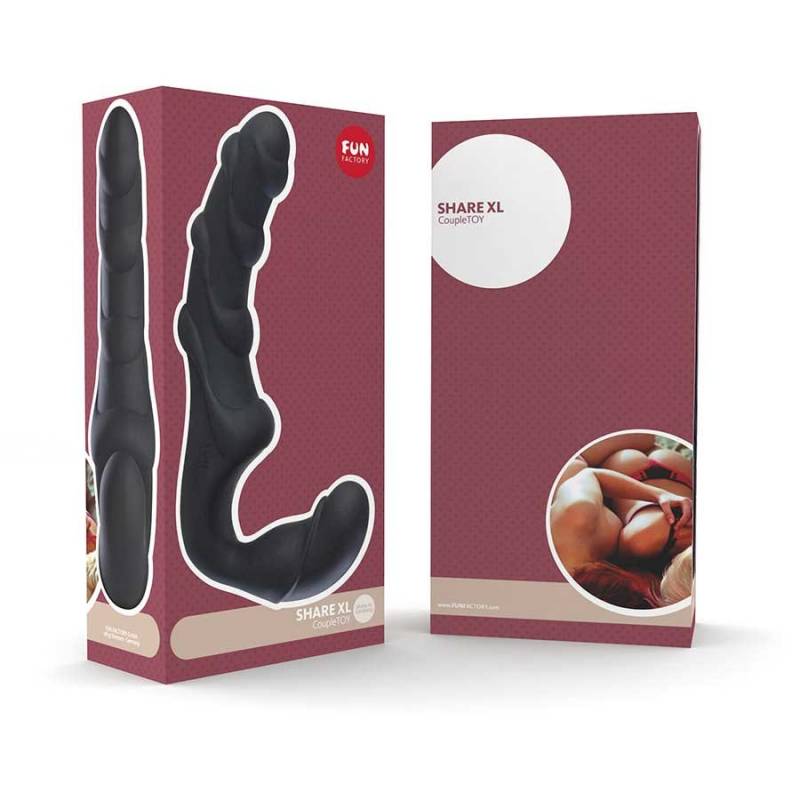 Le Gode SHARE XL de FUN FACTORY joue le rôle d'un gode ceinture sans harnais pour une utilisation en duo avec une double pénétration vaginale et/ou anale.