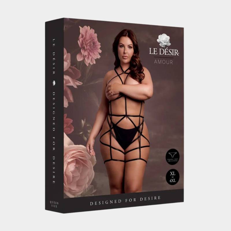 Harnais body à lanières ouvert et audacieux, qui encadre les courbes et révèle juste ce qu’il faut de peau. Bretelles ouvertes, jarretelles intégrées et ajustements multiples pour sublimer chaque silhouette.