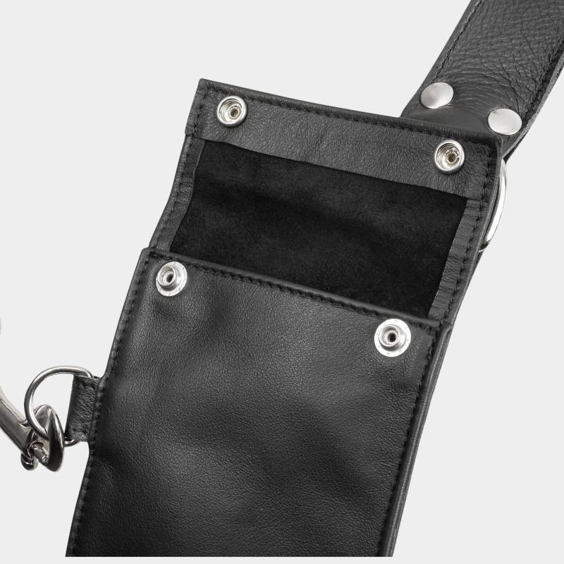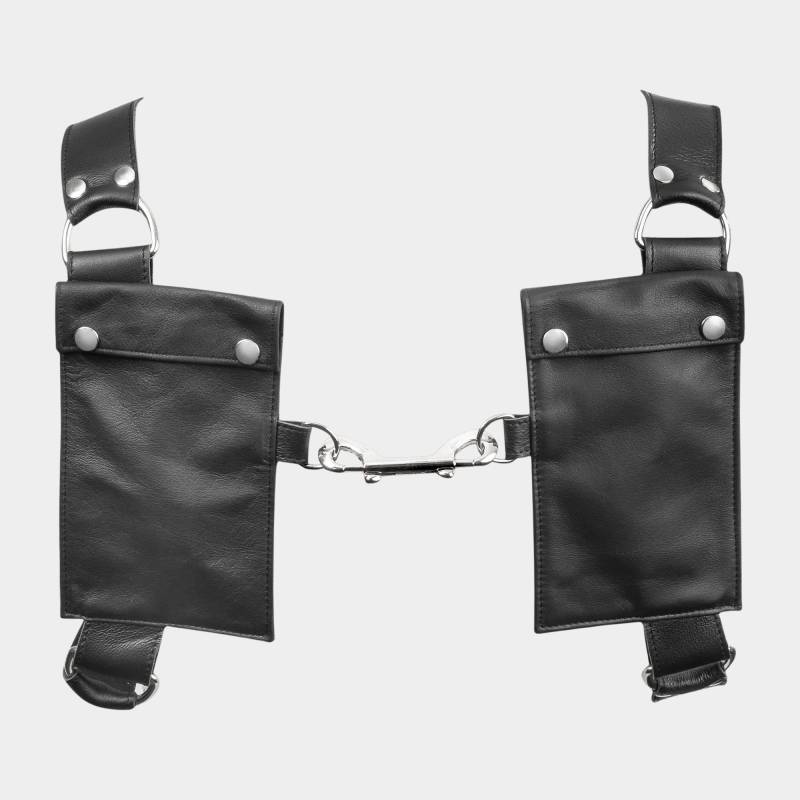 Ajoutez une aura de pouvoir à votre tenue fetish. Ce harnais holster en cuir nappa épouse le torse, souligne les lignes du corps et offre deux poches parfaitement placées pour garder argent, téléphone ou accessoires à portée de main.
