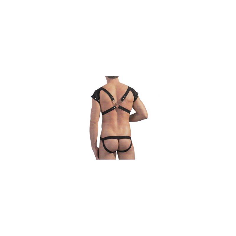 Le Harnais est en tissu élastique et le Jock Strap est en matière Wet Look.