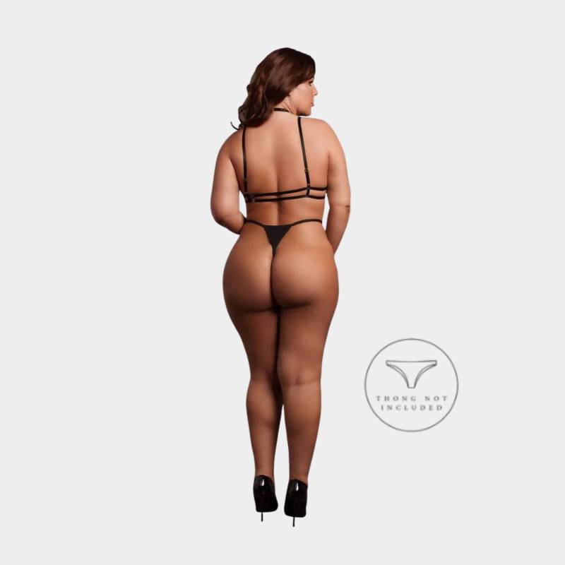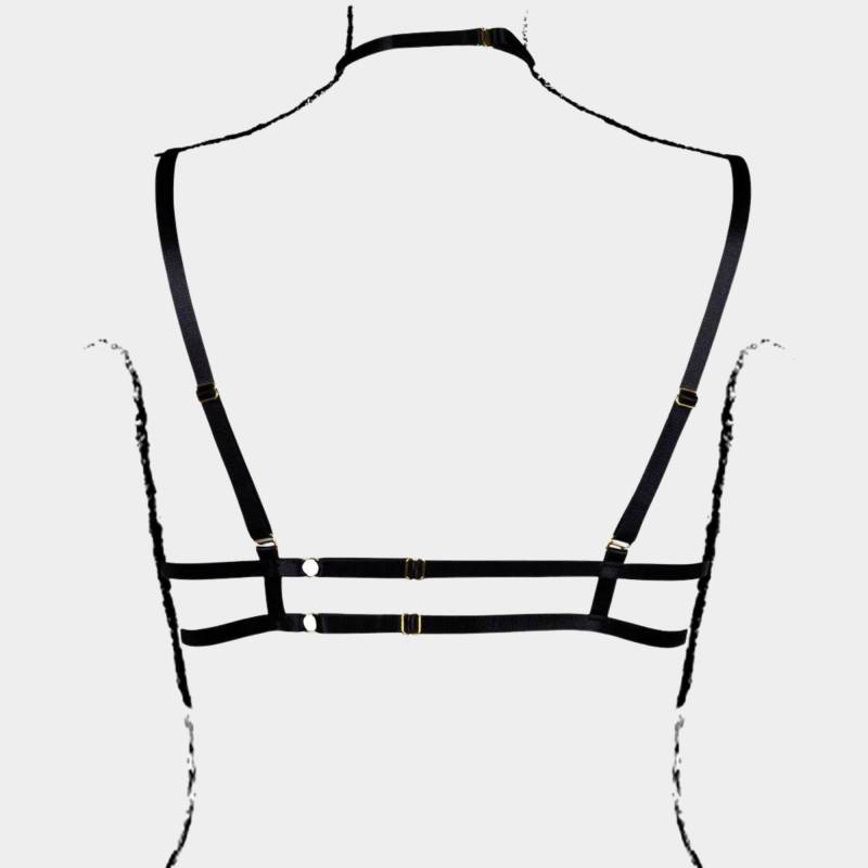 Harnais triangle ouvert, réglable au cou, conçu pour sublimer la silhouette. Lanières noires ajustables, coupe audacieuse, disponible du XS au 4XL. Idéal pour transformer une tenue ou enflammer une scène intime.