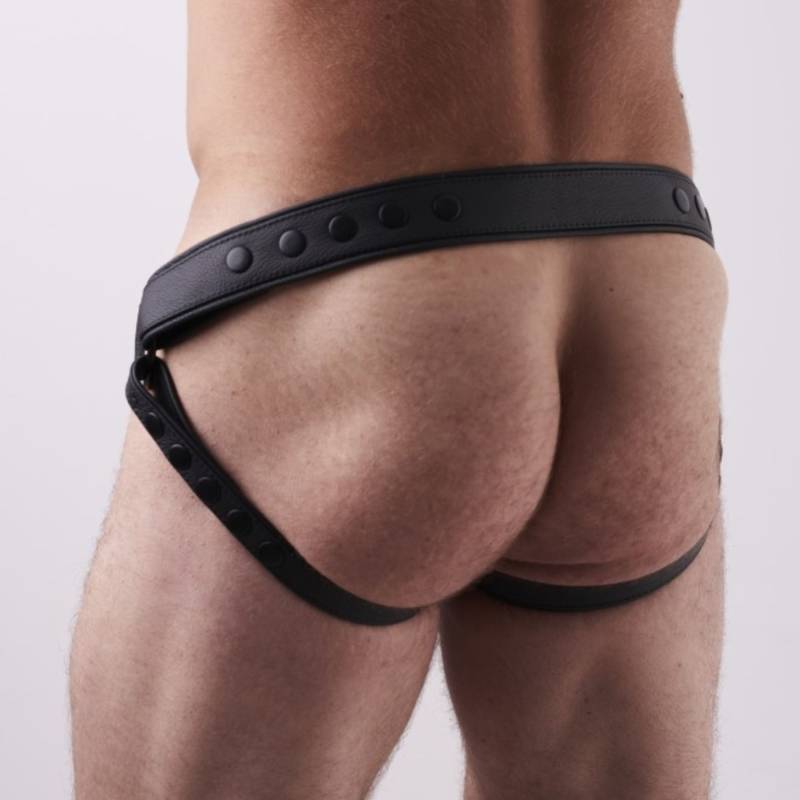 Jockstrap BDSM en cuir noir avec ouverture frontale à pressions, anneaux latéraux et sangles réglables.