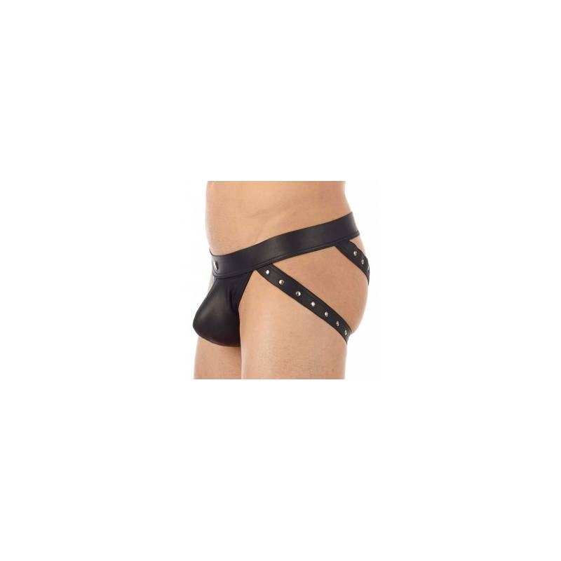 Jockstrap homme en wetlook avec bandes cloutées et double zip au niveau des fesses.
