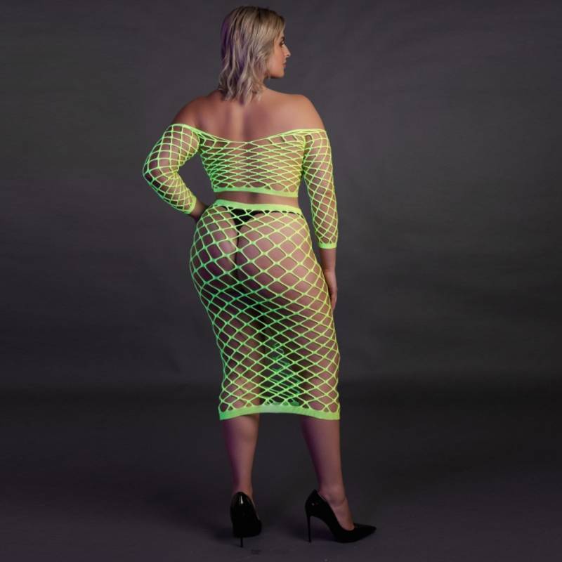 Cette pièce se compose d’un crop top à manches longues et d’une jupe longue larges résilles.