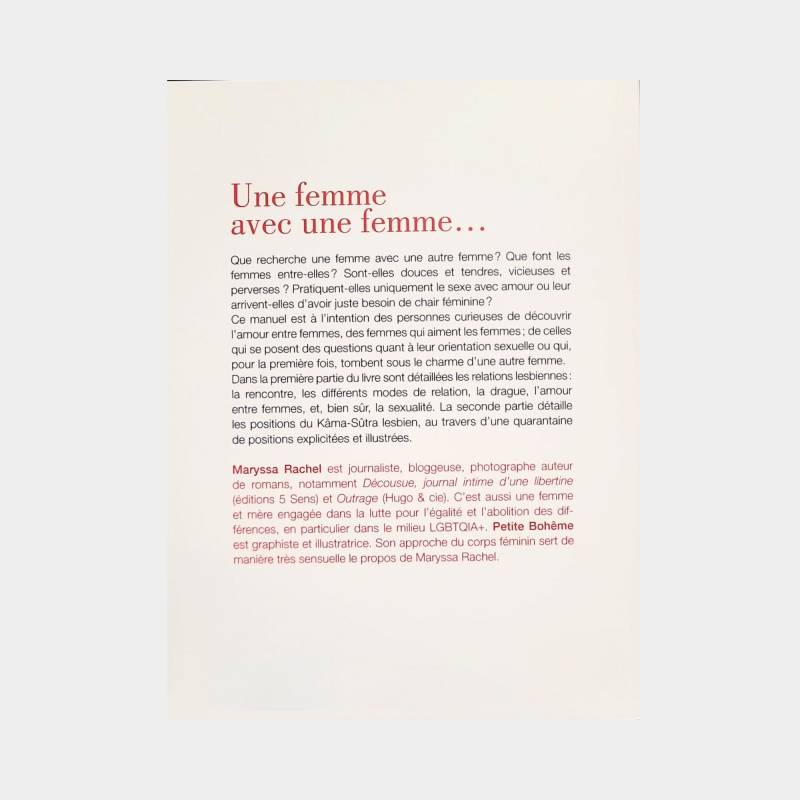 Maryssa Rachel est journaliste, bloggeuse, photographe auteur de romans, notamment Décousue, journal intime dune libertine (éditions 5 Sens) et Outrage (Hugo & cie). Cest aussi une femme et mère engagée dans la lutte pour légalité et labolition des différences, en particulier dans le milieu LGBTQI. Petite Bohême est graphiste et illustratrice. Son approche du corps féminin sert de manière très sensuelle le propos de Maryssa Rachel.