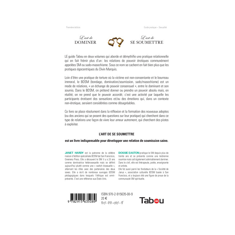 Dans le BDSM, le pouvoir prétendument donné ou pris est en réalité consenti ; il s'agit d'une activité où les participants érotisent des sensations et des émotions qui, dans un contexte non-érotique, pourraient être perçues comme désagréables. Ce livre adopte une approche réfléchie et informative pour les nouveaux adeptes (ou les anciens qui remettent en question leur pratique), offrant des pistes de réflexion pour ceux qui cherchent à vivre leur amour différemment à travers ce type de relations.