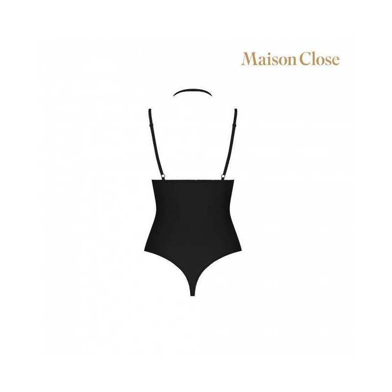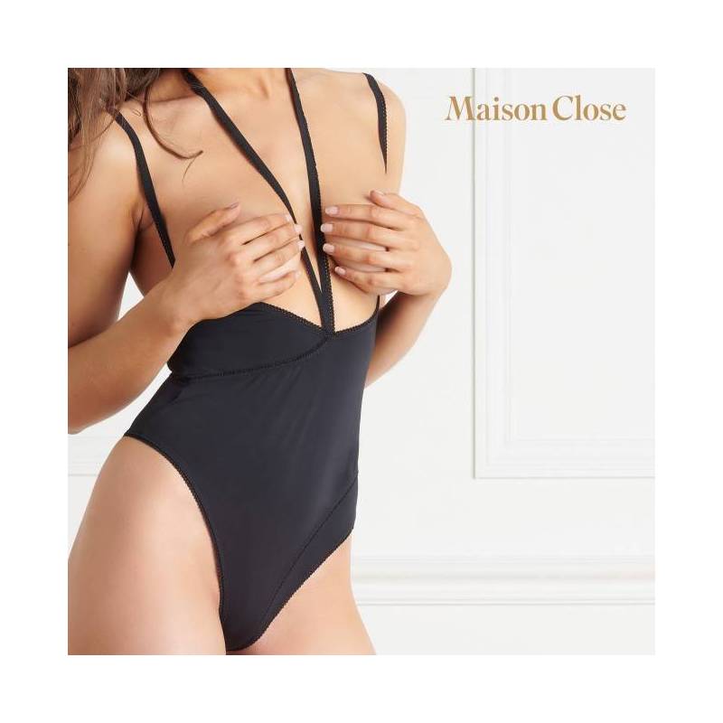 Magnifique body string minimaliste noir de Maison Close, seins nus avec un sublime jeu de lanières.