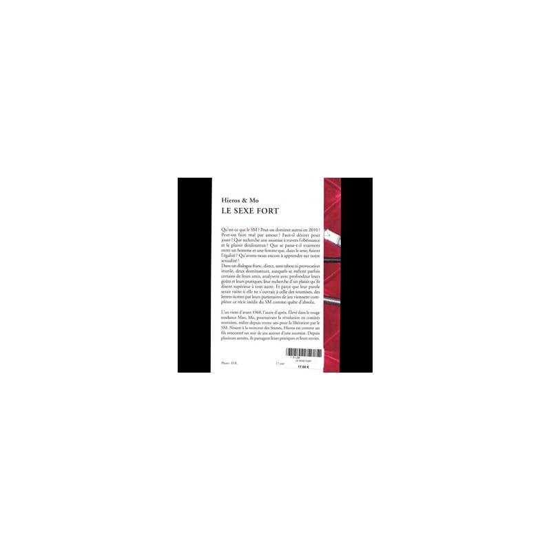 L’un vient d’avant 1968, l’autre d’après. Élevé dans le rouge tendance Mao, Mo, poursuivant la révolution en comités restreints, milite depuis trente ans pour la libération par le SM. Nourri à la noirceur des Stones, Hieros est comme un fils rencontré un soir de jeu autour d’une soumise. Depuis plusieurs années, ils partagent leurs pratiques et leurs envies