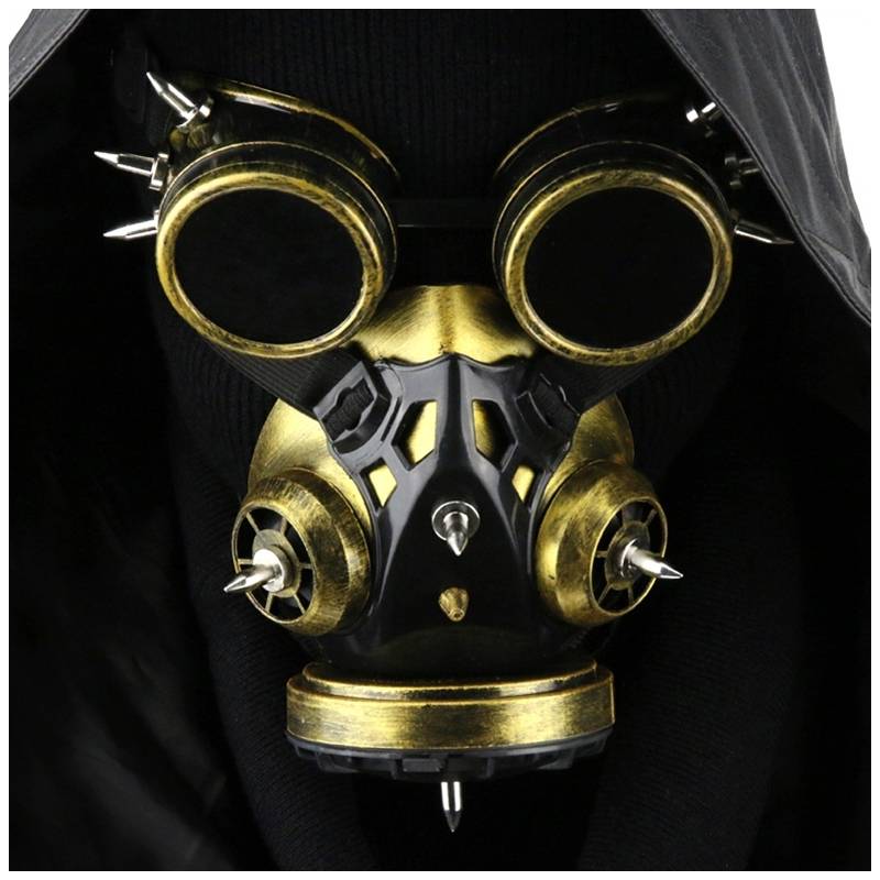 Ce masque à gaz et lunettes sont idéals pour donner un look original.L'accessoire se compose de :Le faux masque à gaz avec imitation des filtres et des pointes en métal Les lunettes avec des pointes en métal. Avec sangles élastiques à l'arrière de la tête. En matière résine plastique