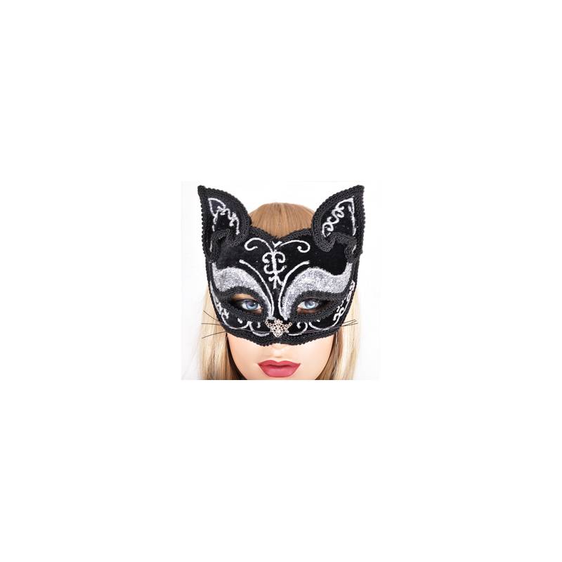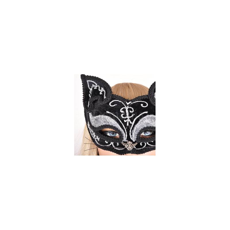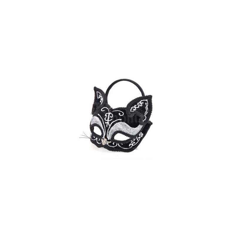 Masque de chat très finement décoré avec ornements paillettes, il est muni d'un serre tête et de fines bandes plastiques transparentes.
