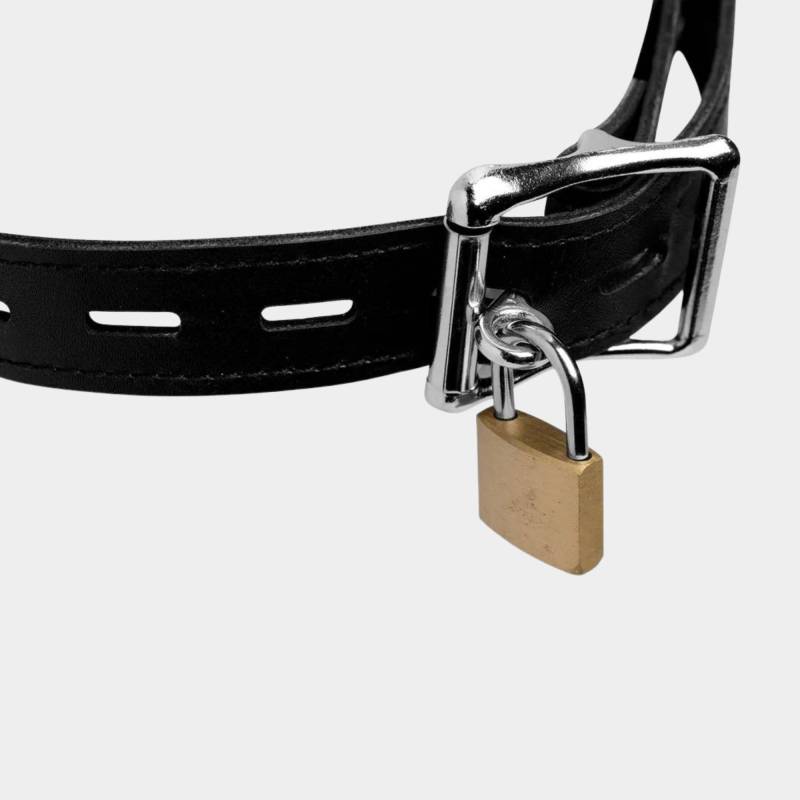 Les sangles s’ajustent facilement pour s’adapter à toutes les morphologies. La boucle cadenassable permet de verrouiller le masque pour empêcher tout retrait sans autorisation, renforçant la dynamique de domination.