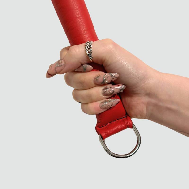 La poignée est équipée d’un anneau métallique solide, assurant une excellente prise en main. Cet anneau permet également d’accrocher facilement la matraque à un harnais, un mur ou un mobilier BDSM.