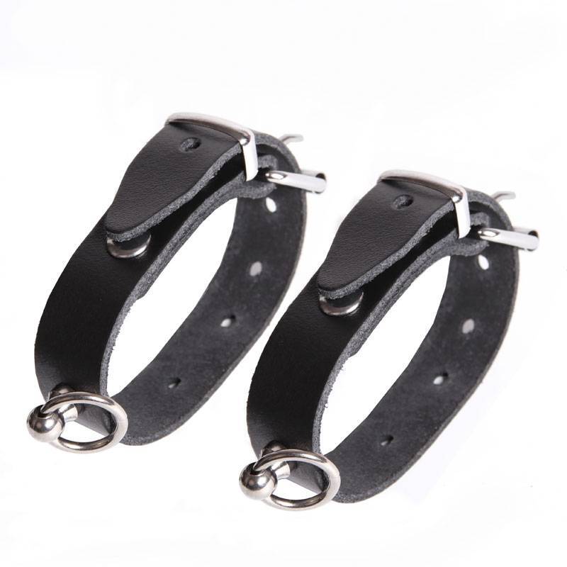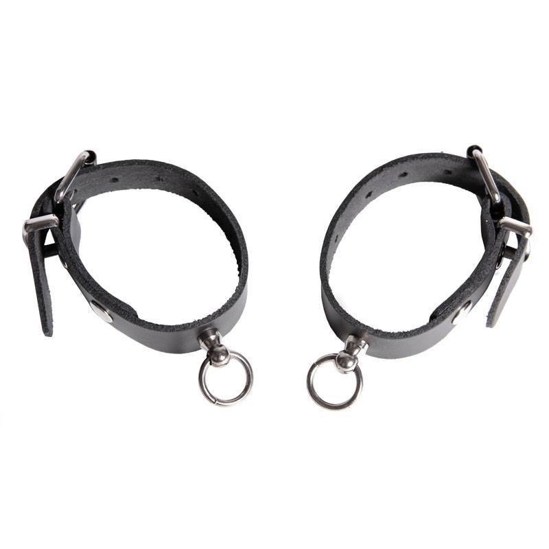 Fines menottes en cuir noir avec petit anneau métal.
