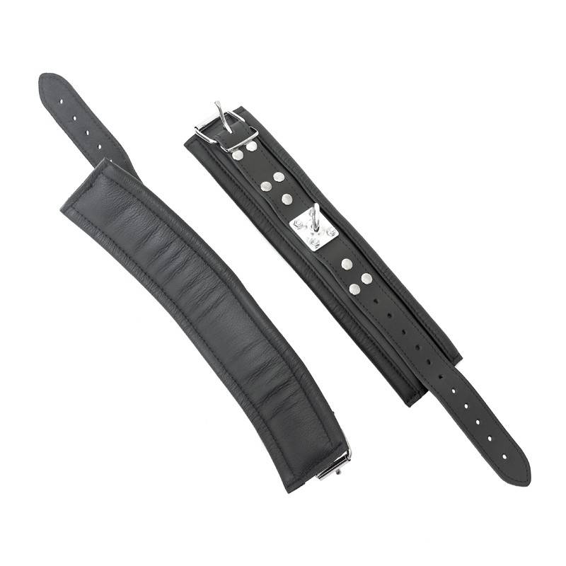 Chevillères en cuir noir molletonnées donc confortables. Une "sur" lanière rivetée à la chevillère et contenant 11 trous avec boucle permet un maintien parfait quelque soit votre taille de cheville.