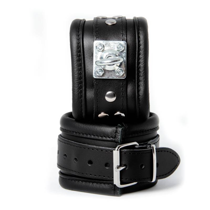Menottes en cuir noir molletonnées avec rembourrage sur les bords pour un confort optimum. Une "sur" lanière rivetée à la menotte et contenant 8 trous avec boucle permet un maintien parfait quelque soit votre taille de poignet.