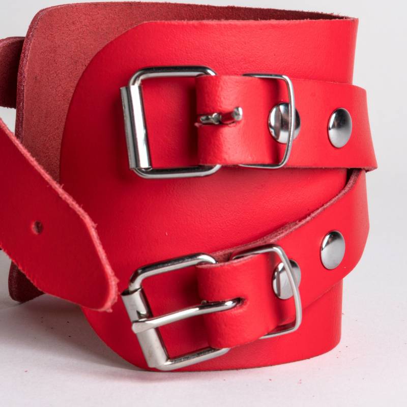 Chaque paire est conçue dans un cuir pleine fleur souple et résistant, teinté rouge vif. Les deux lanières entrecroisées offrent non seulement une esthétique fétichiste spectaculaire, mais aussi un réglage millimétré sur 7 positions. Le poignet est parfaitement maintenu, sans blessure, sans imprécision. L’anneau O-ring permet de relier facilement mousquetons, chaînes ou autres accessoires.