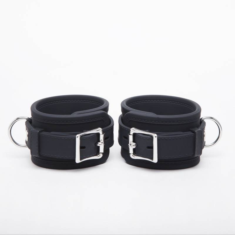 Menottes en silicone noir avec "sur lanières" dotées d'une boucle cadenassable et de trous (6 positions différentes). Attention, aucun cadenas n'est fourni - Voir produits associés.