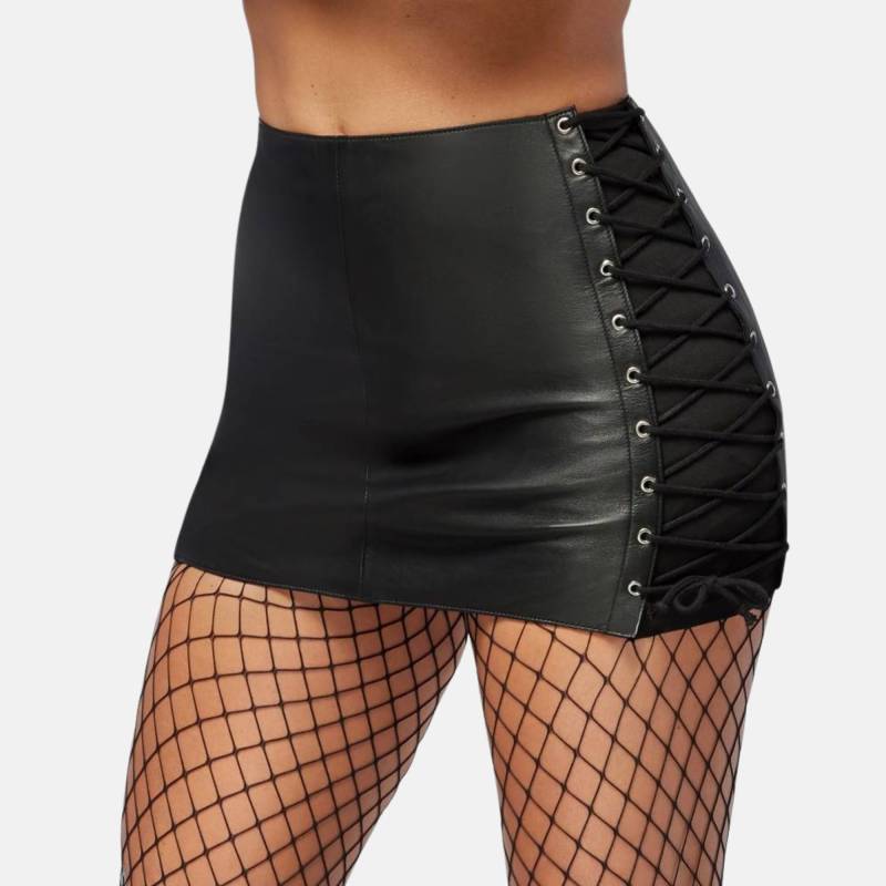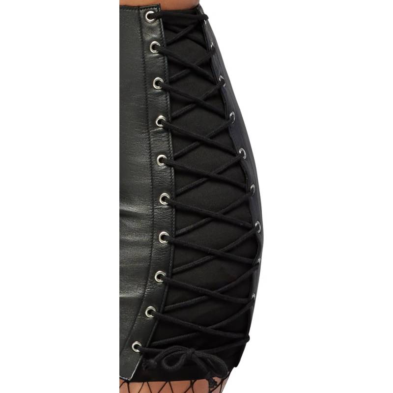 Affirme ton pouvoir avec cette mini-jupe en cuir à laçage latéral.