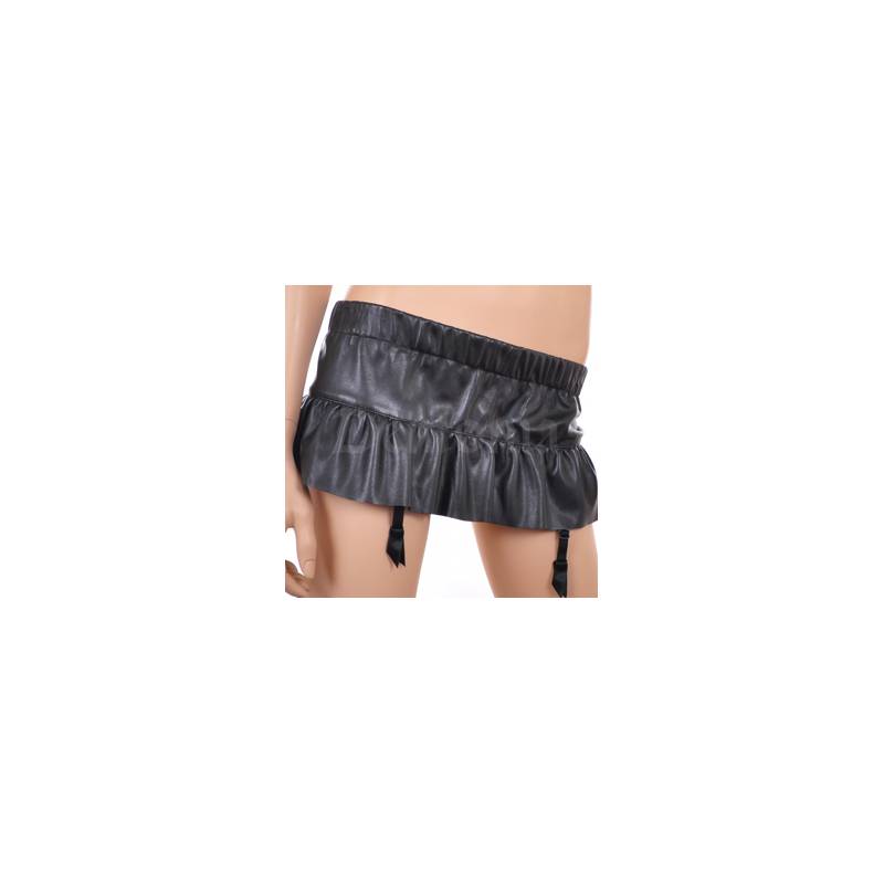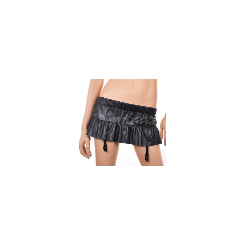 Mini-jupe dans un simili cuir de belle qualité légèrement évasée avec des froufrous sur la partie basse et la ceinture montée sur un élastique.