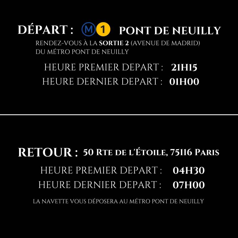 Des navettes seront mises à disposition pour les déplacements depuis la l'arrêt de métro : Pont de Neuilly vers et depuis les Pavillons des étangs, à des créneaux horaires déterminés.